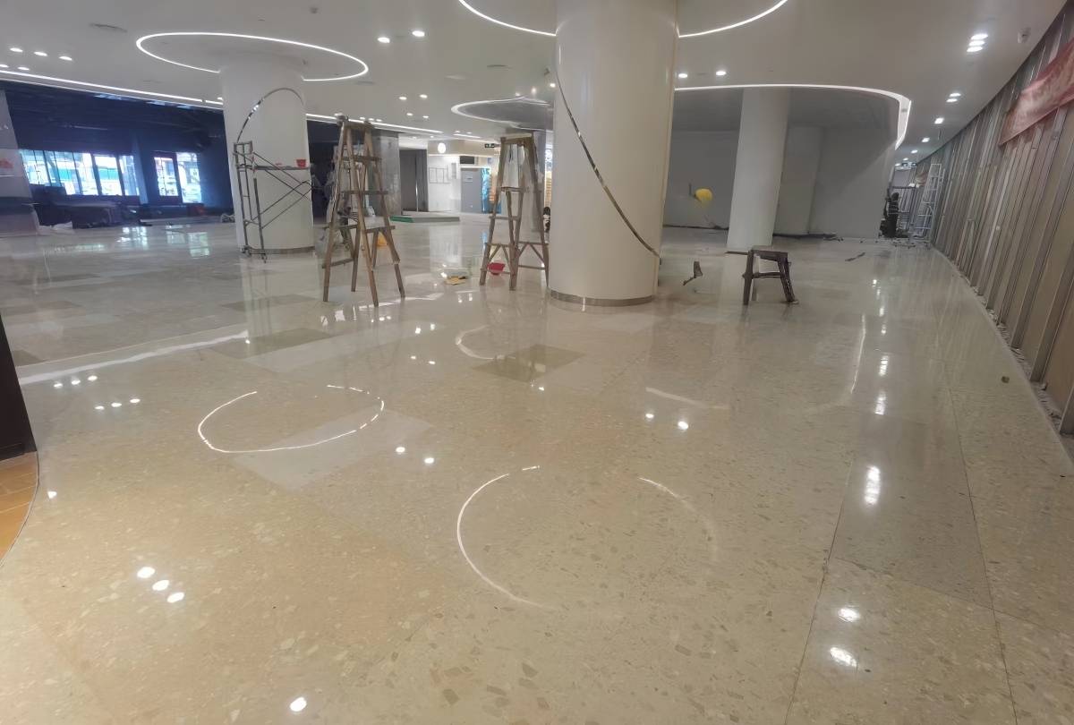 This shopping mall project uses Aoli Stone artificial marble in Anna Beige and Youlan White. The two-color flooring combination creates a bright, clean, and visually refined interior effect, helping improve the overall decorative quality of the mall space.